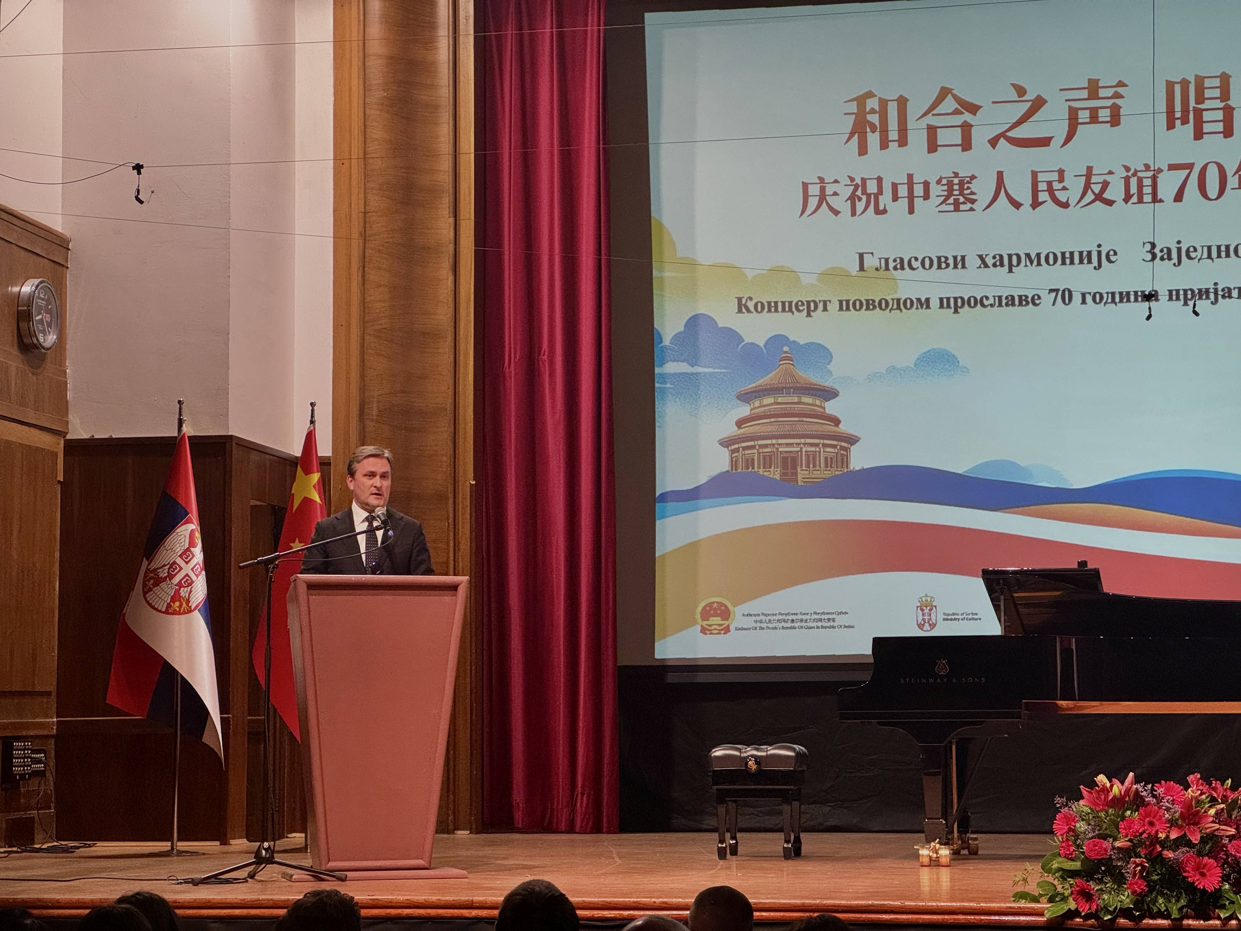 Министар културе Никола Селаковић обратио се на свечаном концерту Кинеске националне опере, одржаном у Задужбини Илије М. Коларца, поводом обележавања јубилеја „70 година пријатељства народа Србије и Кине“.