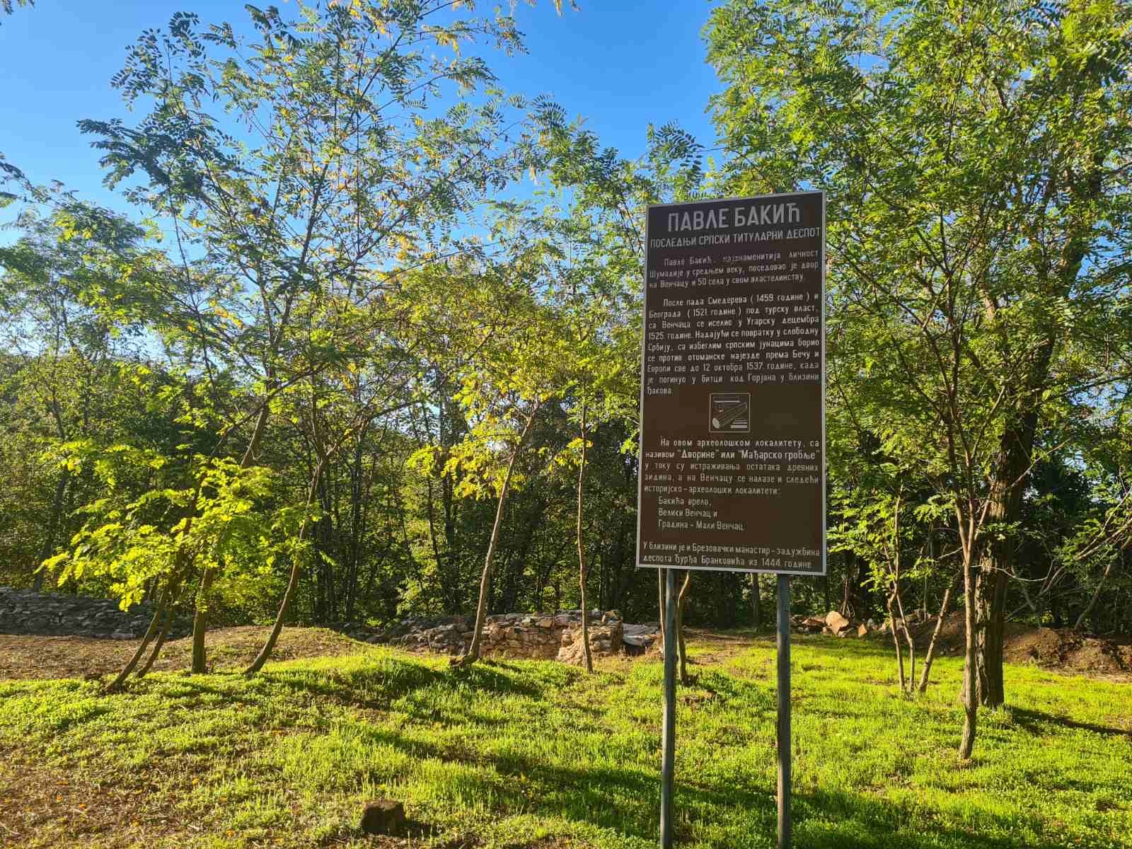 Подсећајући да је Министарство од 2018. године обезбедило преко 14 милиона динара за спровођење археолошких ископавања а да је група археолога на челу са професором Дејаном Радичевићем утврдила трагове присуства средњовековне српске државе, највероватније из времена царства, односно прве половине 14 века и времена владавине прво краља потом цара Стефана Душана као и остатке монументалне сакралне грађевине, цркве која се са врло малим одступањима, готово поклапа са димензијама манастира Грачанице грађеним у вардарском, односно српско-византијском стилу, а која је била фрескописана и од које су остали фрагменти живописа изванредног квалитета, министар је појаснио да проналасци указују да је вероватно реч о владарској задужбини и да је овај храм најсевернија тачка српског сакралног градитељства у 14. веку као и да су на овај локалитет наслоњени остаци нечега што се приписијуе двору последњег српског деспота Павла Бакића.